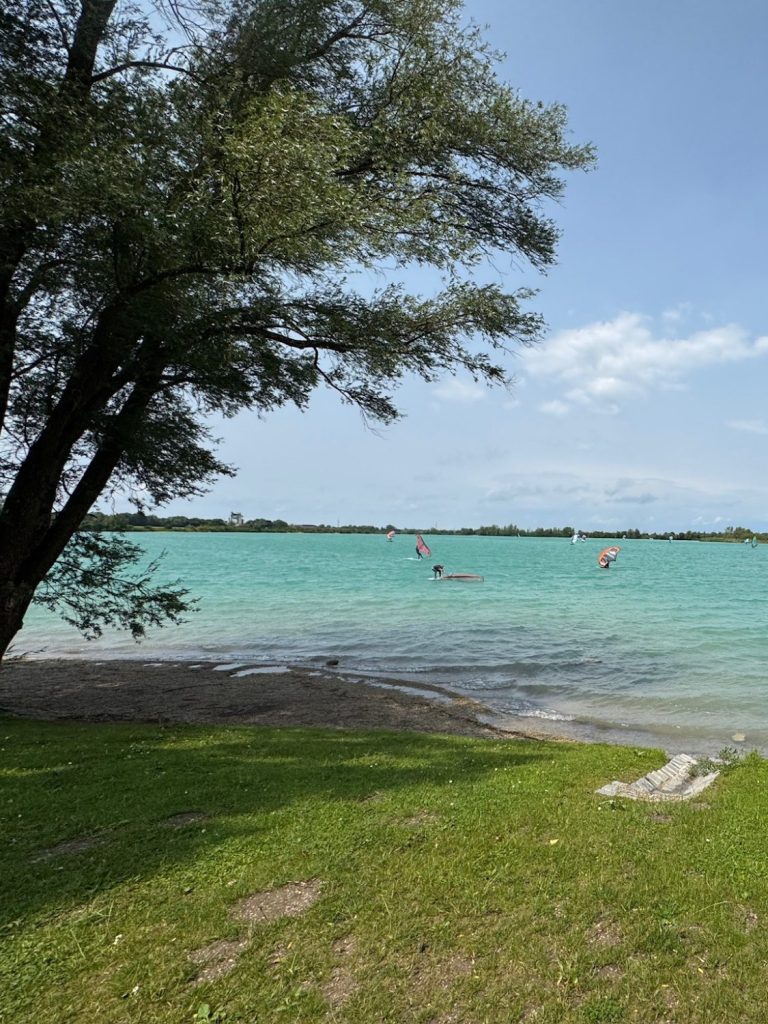 Heute am Kronthaler Weiher herrschten perfekte Bedingungen für alle Wing Foiler: ein konstanter, kräftiger Wind ließ die bunten Wings über das Wasser tanzen. Die Bucht war voll mit begeisterten Surfern, die die idealen Böen für lange Rides nutzten. Gegen Nachmittag zog ein kurzes, aber intensives Gewitter durch – dunkle Wolken und ein paar kräftige Schauer sorgten für eine dramatische Kulisse. Doch kaum war das Unwetter weitergezogen, brach die Sonne durch die letzten Wolken und tauchte den See in ein fast schon karibisches Licht. Das Wasser schimmerte in leuchtendem Türkis, und mit dem auffrischenden Wind ging es für alle wieder zurück aufs Wasser – ein rundum spektakulärer Tag am Weiher.